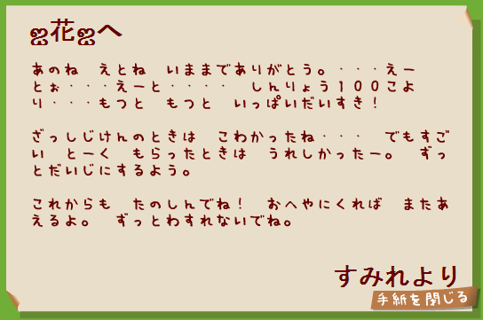 では、これからも末永くよろしく。花がいてくれてよかったよ。ありがとう。